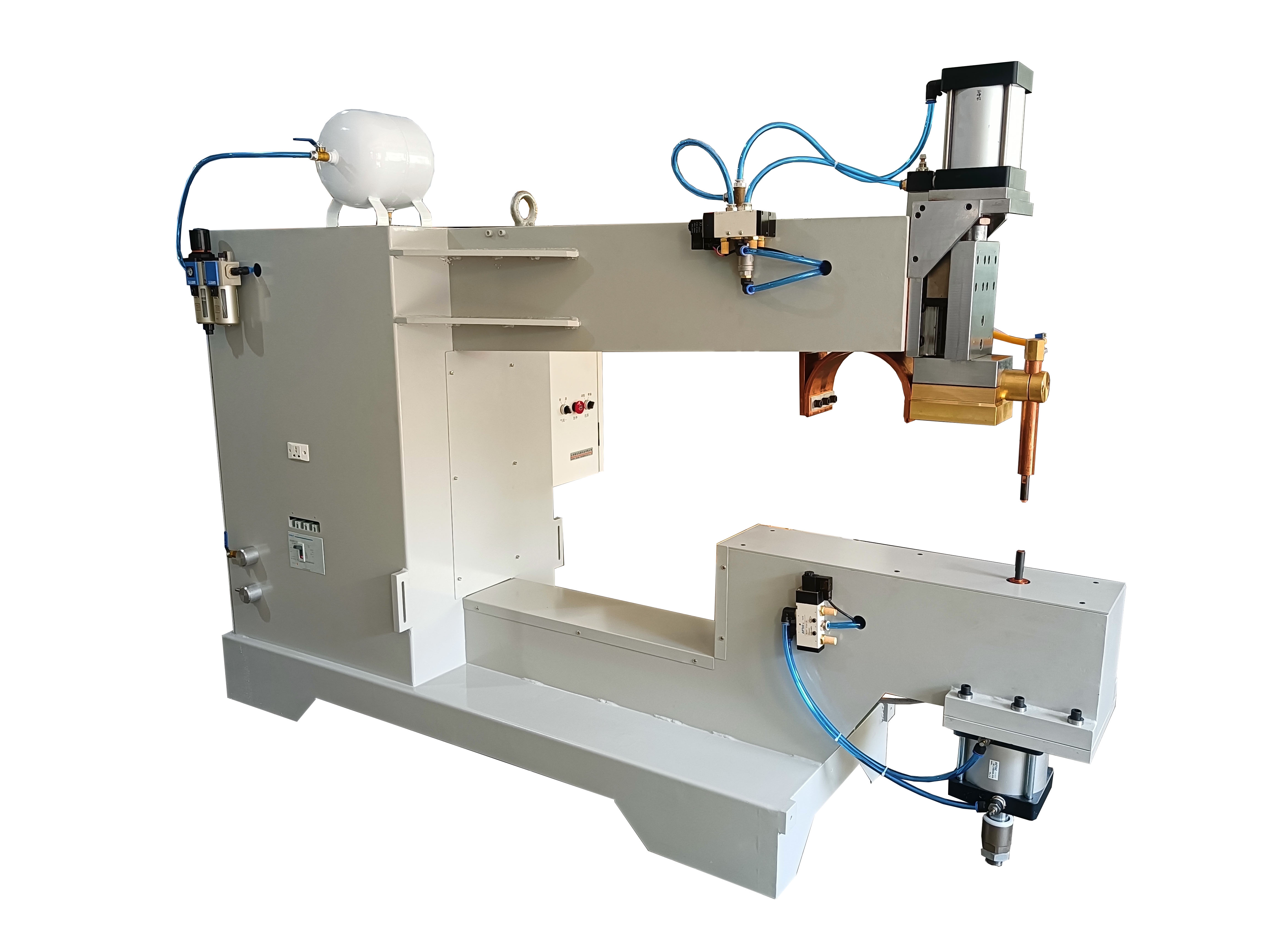 縫焊機(jī)就是指焊件裝配成搭接或?qū)咏宇^并放置于兩滾輪電極中間,滾輪電極加壓焊件并旋轉(zhuǎn),連續(xù)或斷續(xù)脈沖送電,形成一條連續(xù)焊縫的電阻焊機(jī)器??梢哉f(shuō),縫焊機(jī)是點(diǎn)焊中的一種演變。