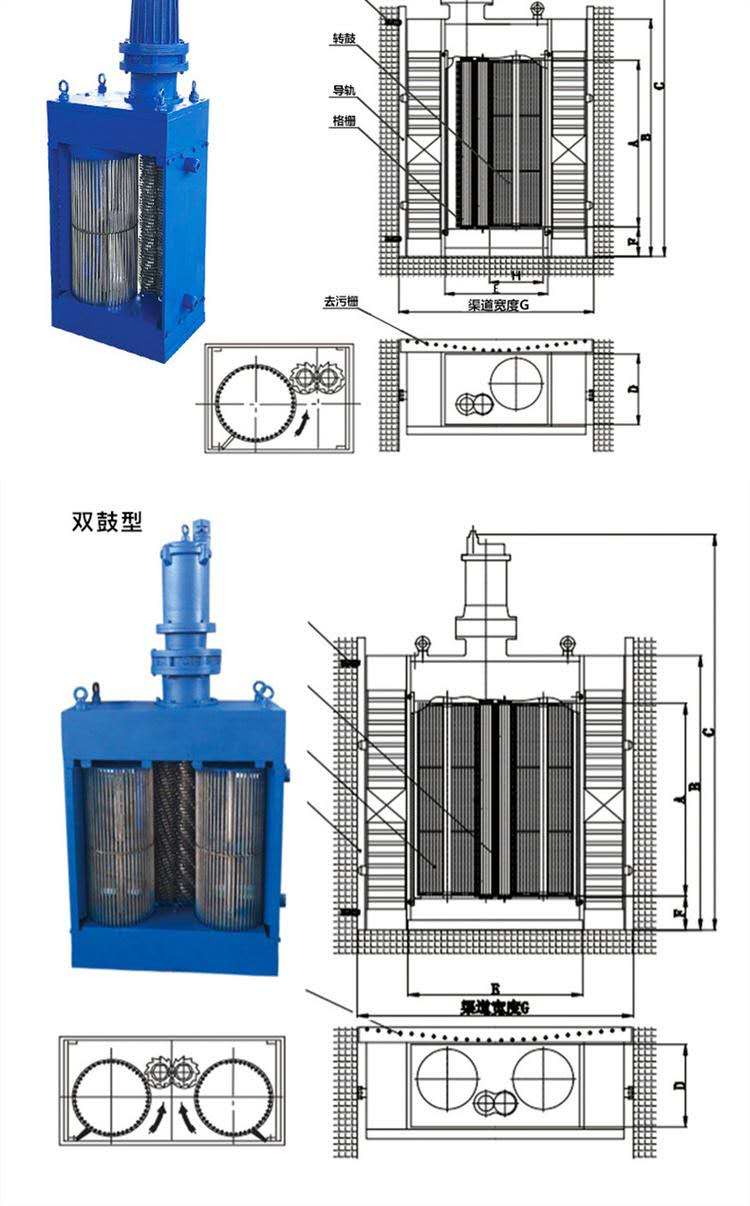 粉碎型格柵由干濕兩用防爆電機(jī)、變速箱、變速器、刀片、立式滾筒、密封、安裝支架、溢流格柵、潛水電纜、備用手動(dòng)格柵等組成的粉碎格柵清洗機(jī)。電機(jī)啟動(dòng)后,葉片和立式滾筒以不同的速度旋轉(zhuǎn),污水進(jìn)入滾筒區(qū)并送到切割區(qū)后,旋轉(zhuǎn)柵格截取污水中的固體浮物。采用差動(dòng)旋轉(zhuǎn)的兩組葉片在軸向和徑向快速切割。它被粉碎成6~10 mm的小顆粒,大部分其他污水和足夠小的顆粒直接通過滾筒區(qū)域,破碎后的小顆粒隨著水泵的抽水而流動(dòng)。