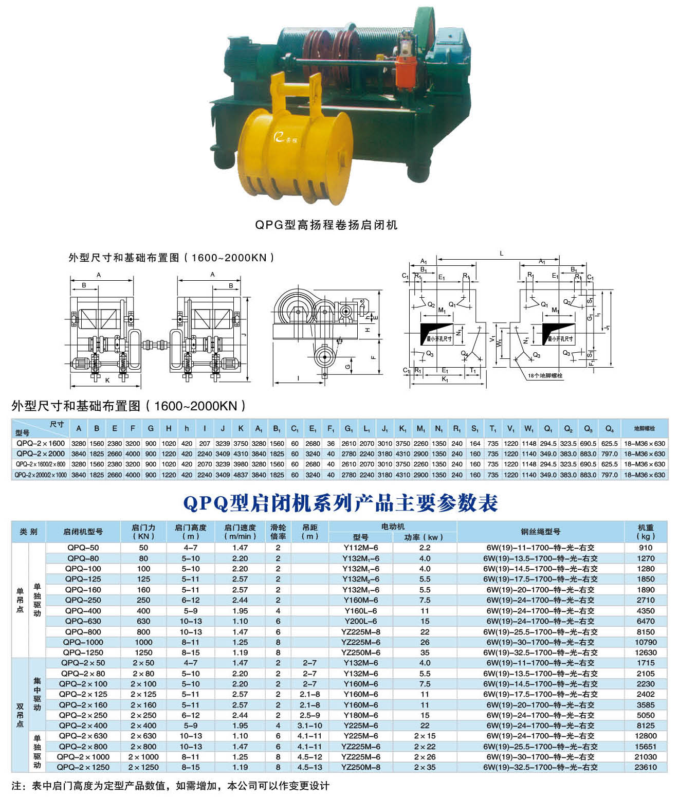 卷揚(yáng)啟閉機(jī)有多種型號:可以分為QPQ型普通卷揚(yáng)啟閉機(jī)、QPK型快速卷揚(yáng)啟閉機(jī)、QPG型高揚(yáng)程卷揚(yáng)啟閉機(jī)、QPT型臺車式卷揚(yáng)啟閉機(jī),QPM型門式卷揚(yáng)啟閉機(jī),QH型弧門卷揚(yáng)啟閉機(jī)。卷揚(yáng)啟閉機(jī)又分為:平門卷揚(yáng)式啟閉機(jī);弧形門卷揚(yáng)式啟閉機(jī);雙吊點(diǎn)卷揚(yáng)式啟閉機(jī);快速卷揚(yáng)式啟閉機(jī);移動式臺車啟閉機(jī);雙吊點(diǎn)卷揚(yáng)式啟閉機(jī)分為:集中驅(qū)動和單獨(dú)驅(qū)動兩種;卷揚(yáng)式啟閉機(jī)手搖、電動兩用式規(guī)格分為:5噸、8噸、12噸、16噸、25噸;電動式規(guī)格分為:40噸、63噸、80噸、100噸、125噸、160噸、200噸,可以根據(jù)用戶要求設(shè)計,并能生產(chǎn)雙吊點(diǎn)卷揚(yáng)式啟閉機(jī),該機(jī)是一種水利工程專用機(jī)械,廣泛用于水利工程閘門的啟閉,是農(nóng)田灌溉、水產(chǎn)養(yǎng)殖、農(nóng)業(yè)經(jīng)濟(jì)開發(fā)區(qū)、污水處理廠、水利發(fā)電站、水庫(水閘、堤壩、隧道、管 道)等進(jìn)水、退水閘的配套機(jī)械,山區(qū)、平原有、無電地區(qū)均可使用。
