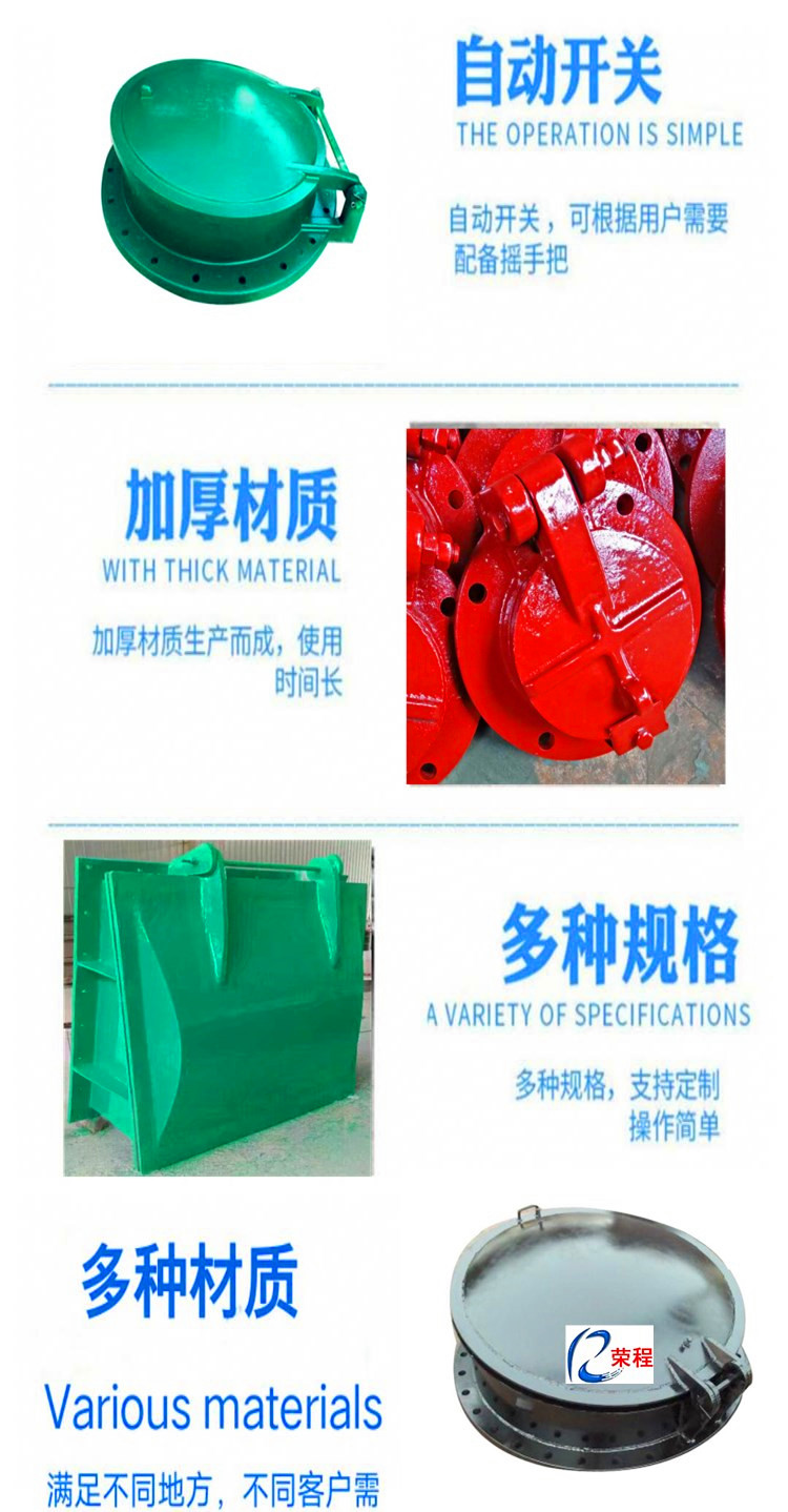 鋼制拍門具有流道正向單向開啟和反向關(guān)閉的作用。拍門的閥蓋借助于自身配重的平衡作用,在水流的作用下使門頁自動(dòng)開啟或關(guān)閉,或稍加外力作用使門頁開啟或關(guān)閉;拍門蓋上設(shè)有拉環(huán),拉動(dòng)拉環(huán)此蓋的開啟角度應(yīng)大于60度,無卡阻現(xiàn)象,開關(guān)應(yīng)自由靈活,當(dāng)拍門部分泡在水中,管道內(nèi)部壓力較大,反向壓力較小時(shí),拍門允許部分泄漏量,當(dāng)河道水壓增大時(shí),拍門將自動(dòng)關(guān)閉密封。