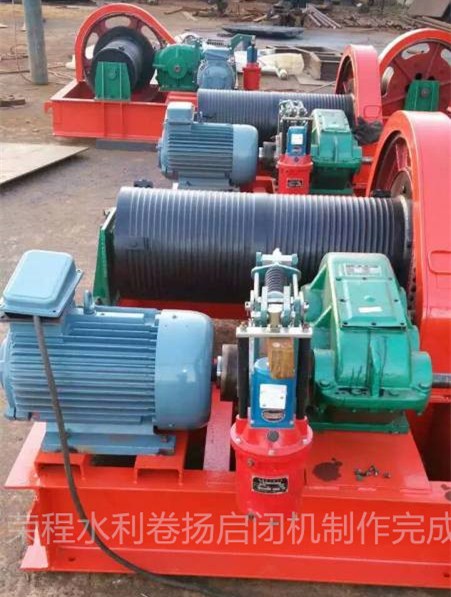 卷揚(yáng)機(jī)通過齒輪箱和減速齒輪減速,減速過程大,速比大。有時它通過滑輪組以擴(kuò)大比例,從而可以獲得更大的開啟力,這適用于具有較大孔徑和水頭的閘門。鋼絲繩圍繞繩索鼓,一般包圍單層,也可以圍繞多層。因此,提升機(jī)的跳閘實際上是無約束的,并且以更大的行程打開閘門或深孔閘門是方便的。鋼絲繩的力方向可以適當(dāng)擺動,也可以通過附加的埋入式轉(zhuǎn)向滑輪來改變。因此,閘門與提升機(jī)之間的協(xié)作非常靈活。在選擇電力時,升降和關(guān)閉速度較快,適合于事固閘門和經(jīng)常開啟的閘門的開閉。