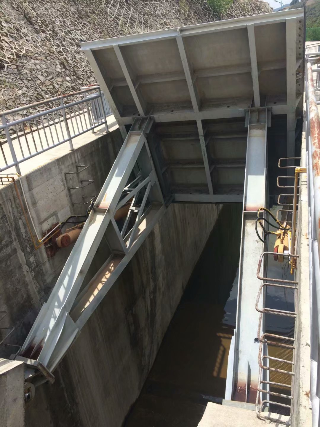 弧形鋼閘門系統(tǒng)采用液壓缸驅(qū)動(dòng),壩體坍塌可完全擱置在地板上,不堵水。當(dāng)水被阻塞時(shí),擋水板由閘門后面的支撐框架支撐,氣缸返回活動(dòng)柱塞,從而有效地保護(hù)柱塞免受腐蝕。這種新型門結(jié)構(gòu)獲得了國家發(fā)明專利�;⌒武撻l門是目前設(shè)計(jì)合理的閘門之一。安裝、操作和操作方便�?勺杂烧{(diào)節(jié)水的高度。它不受河流寬度、地理和氣候條件的限制。使用壽命長達(dá)50年。